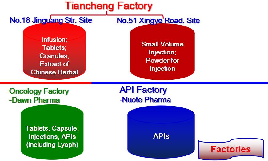 Now Hebei Tiancheng Pharma is a enterprises group containing Tiancheng Pharma (Generic drugs factory which has two sites at No.18 Jinguang Street and No.51 Xingye Road), Dawn Pharma (Oncology drugs factory), Nuote Pharma (API Factory), as well as Tianjin YTC Pharma (R&D Institute).