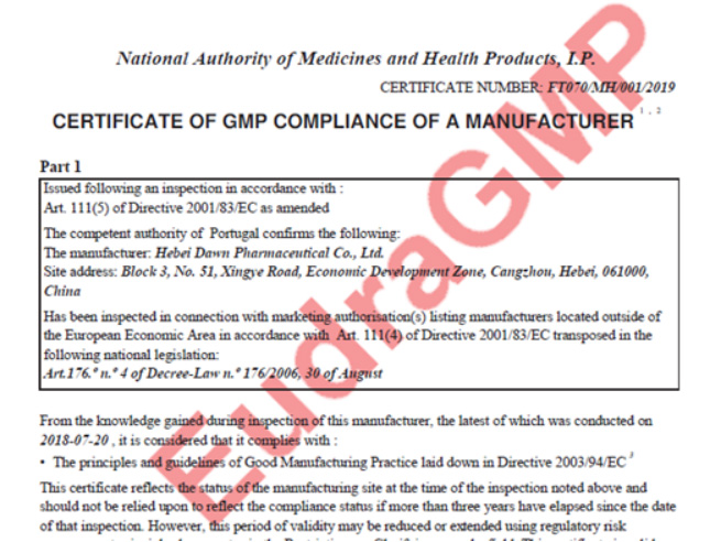 11月04日,河北天成藥業股份有限公司全資子公司河北道恩藥業有限公司(Hebei Dawn Pharmaceutical Co., Ltd.)收到了無菌注射劑 EU GMP證書(認證范圍:凍干粉針劑和小容量注射劑;證書編號:FT070/MH/001/2019)。此次 EU GMP證書的獲得,是天成藥業制劑國際高端認證路上的又一重大突破,代表其質量管理水平已達到國際高端水準,也意味著道恩藥業的抗腫瘤無菌注射劑在歐盟市場打通了GMP藥政和技術壁壘,對其進軍國際制劑高端市場具有里程碑意義,同時為滄州市首家取得該證書的藥企。