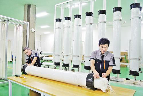 8月20日,海派特膜科技(河北)有限公司工人在生產車間組裝柱式膜組件。 本組圖片由本報記者王雅楠攝